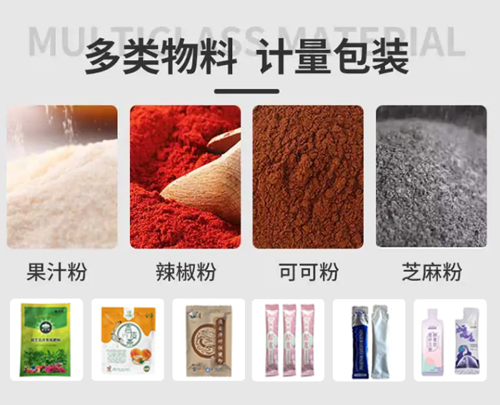 全自動小袋辣椒粉包裝機適用于酵素粉、調料粉、中藥粉、足浴粉、酵母粉、咖啡粉、豆奶粉、味精雞精、白糖、奶茶粉、果汁粉、芝麻粉、紅糖粉、花卉有機肥、固體飲料粉末、魚藥粉、豆漿粉、咖喱粉、核桃粉等等,適用范圍非常的廣泛,幾乎涵蓋了食品、醫藥、化工、農化、日化行業的眾多粉末包裝。不僅如此,小型粉劑包裝機還能夠適應多種不同規格的包裝需求,只需在操作面板上簡單調整參數,即可實現包裝重量、袋型尺寸等的快速切換,滿足市場多樣化的產品包裝要求。它還能兼容不同材質的包裝薄膜,如PE、PP、PET等,多種包裝材料可以選擇。