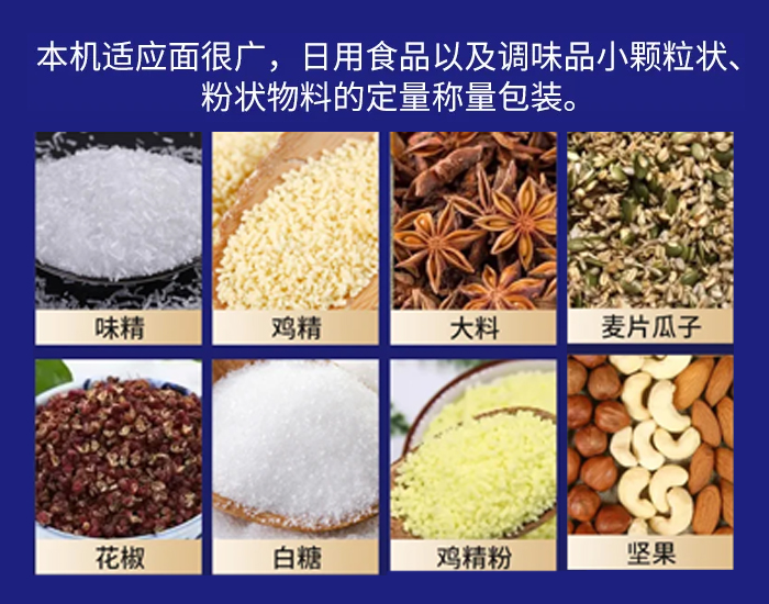 全自動給袋式顆粒包裝機的應用范圍廣泛,在食品、醫藥、飼料等多個行業中均得到了廣泛應用。在食品行業中,主要用于米、糖、鹽、堅果、調料、燕麥片、食品添加劑、味精、雞精等顆粒狀、小顆粒粉末的包裝;在醫藥行業中,用于沖劑、保健藥品的包裝;在化工行業中,可對肥料、塑料、化工添加劑、染料等物料進行包裝;在日化等行業中,可包裝包裝鹽、洗衣粉、疏通劑以及種子肥料進行包裝。