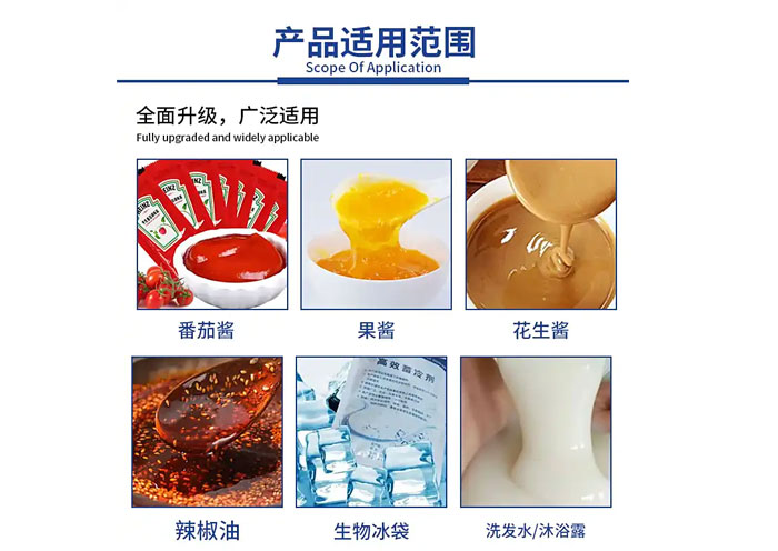 全自動(dòng)立式香菇醬包裝機(jī)適用于食品、農(nóng)業(yè)、日化等行業(yè)中的醬料膏體的袋裝包裝,如番茄醬、沙拉醬、辣椒醬、辣椒油、芝麻醬、花生醬、芥末醬、洗發(fā)水、護(hù)發(fā)素、沐浴露、止咳露、蜂蜜、護(hù)手霜、藍(lán)莓醬、外賣調(diào)料包、糯米膠、紅豆沙、餡料、貓條、寵物零食等。