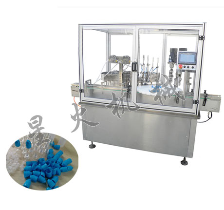 滴眼液灌裝旋蓋機適用于2-30ML各種材質的圓形扁形塑料或玻璃瓶的電子煙液灌裝.本機由高精度凸輪分度機構提供分度等分盤定位上塞上蓋;加速度凸輪傳動提供旋蓋頭的升降;恒扭矩旋蓋;蠕動泵計量灌裝;觸摸屏控制.無瓶不灌裝,不加內塞,外蓋.具定位精卻,傳動平穩,保護瓶蓋,計量準.操作簡單等優點。