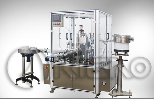 乳液灌裝旋蓋聯動一體機具有理瓶,瓶自動檢測(有瓶灌裝,無瓶不灌裝,有瓶落蓋,無瓶不落蓋),自動灌裝,自動落外蓋,自動旋蓋、不合格品自動剔除等功能,并配有潔凈層流罩,確保機器區域內空氣潔凈度。該機完全符合GMP藥品生產規范。