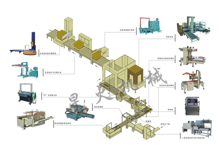 本流水線所用到的產(chǎn)品包括:自動開箱機、L型全自動封口機+熱收縮機、自動裝箱機、稱重機、噴碼機、全自動折蓋封箱機、全自動四角邊封箱機、井字型捆扎機、碼垛系統(tǒng)、全自動棧板打包機、全自動水平式捆扎機、全自動在線式纏繞機,其中機械可配套流水線使用,亦可單機作業(yè)。