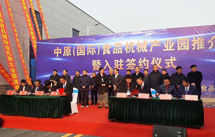 星火包裝機董事長郭先鋒(右二)正與中原食品機械產(chǎn)業(yè)園簽約