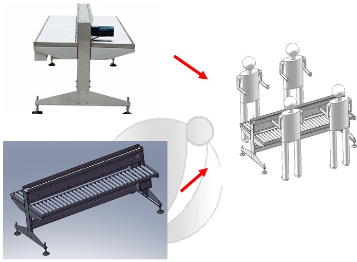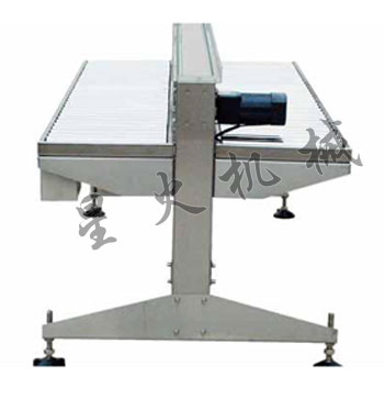 該設備作為裝箱工作臺面,工作人員可在兩邊分別把包裝好的瓶子裝入箱子。下方為紙箱平臺(帶滾輪),上方為輸送帶(可根據需求調速)。
