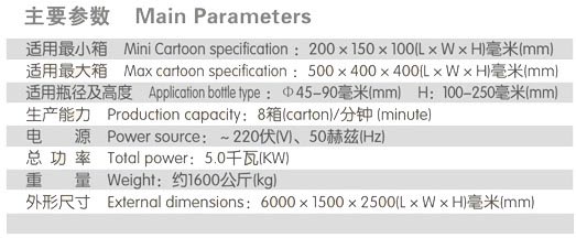 配套瓶裝生產(chǎn)線的后道全自動(dòng)裝箱生產(chǎn)。同時(shí)擁有多項(xiàng)國家技術(shù)專li,整機(jī)性能可靠,產(chǎn)能高,包裝效果美觀。