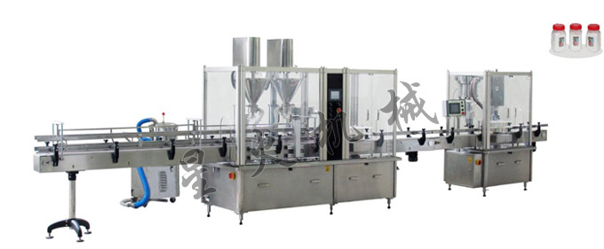粉末灌裝旋蓋流水線集粉劑充填旋蓋、電磁感應封口、雙面貼標、噴碼等功能為一體,自動完成粉劑的充填包裝過程。該聯動線為顆粒粉狀等物料自動計量灌裝旋蓋貼標流水線,具有自動送罐、上料、計量、灌裝、旋蓋、封口、貼標、噴印等功能。所有與物料接觸部分均為不銹鋼,整線由PLC控制,伺服電機計量,具有精度高、速度快、貼標精卻、噴碼清晰準確等優點,適用于大多數粉末產品和特別產品的灌裝、旋蓋、貼標等包裝。
