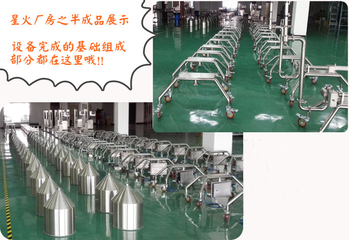 每一個設(shè)備的完成都是由一個一個的半成品組合形成的,半成品更是一個完整設(shè)備的很初的形態(tài),可以說半成品是很能看出設(shè)備優(yōu)質(zhì)的。下圖為星火顆粒醬類包裝機廠房半成品區(qū)的展示。